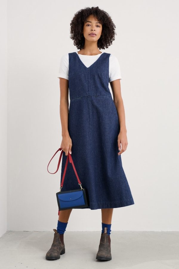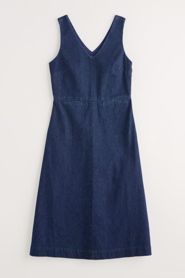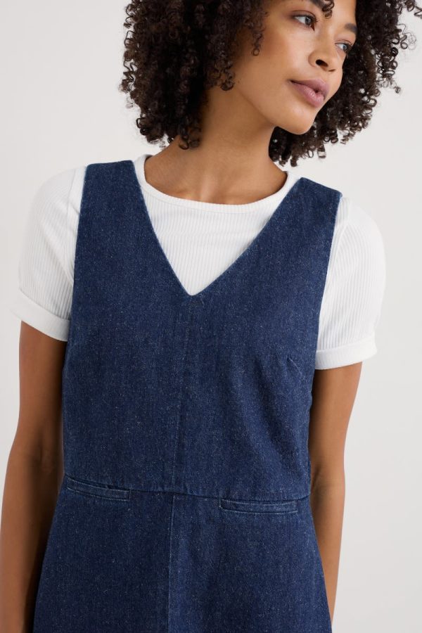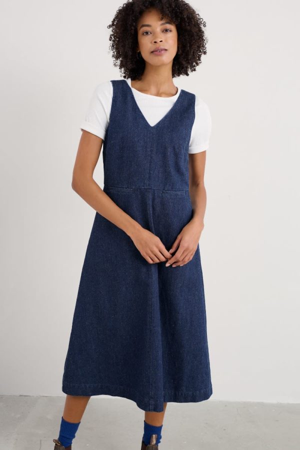 Meet a new-season favourite: our Audrey pinafore dress. It has a full midi-length skirt, with darts at the bust and waist emphasising the waisted shape. Soft v-necks at the front and back add a stylish feature, while welt pockets at the waistband provide a surprising little detail. A versatile piece to complement your choice of top.