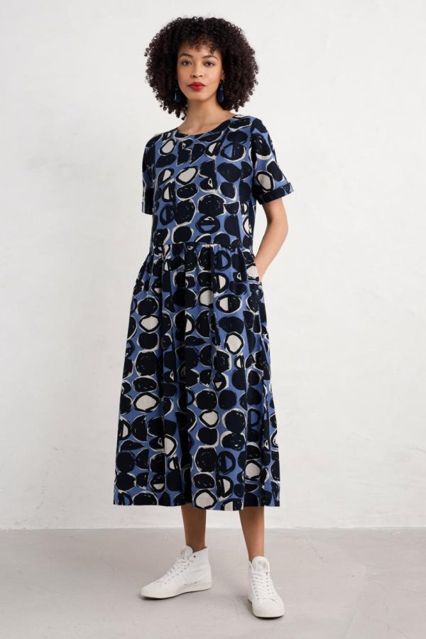 A loose-fit dress with a dropped waistline, in soft organic cotton. We’ve given it side seam pockets and gathers to the skirt that lend the style a beautiful swish. It’s perfect paired with crisp white trainers or heeled leather boots.If you prefer a neater fit, we recommend you choose a size down from what you’d usually wear.