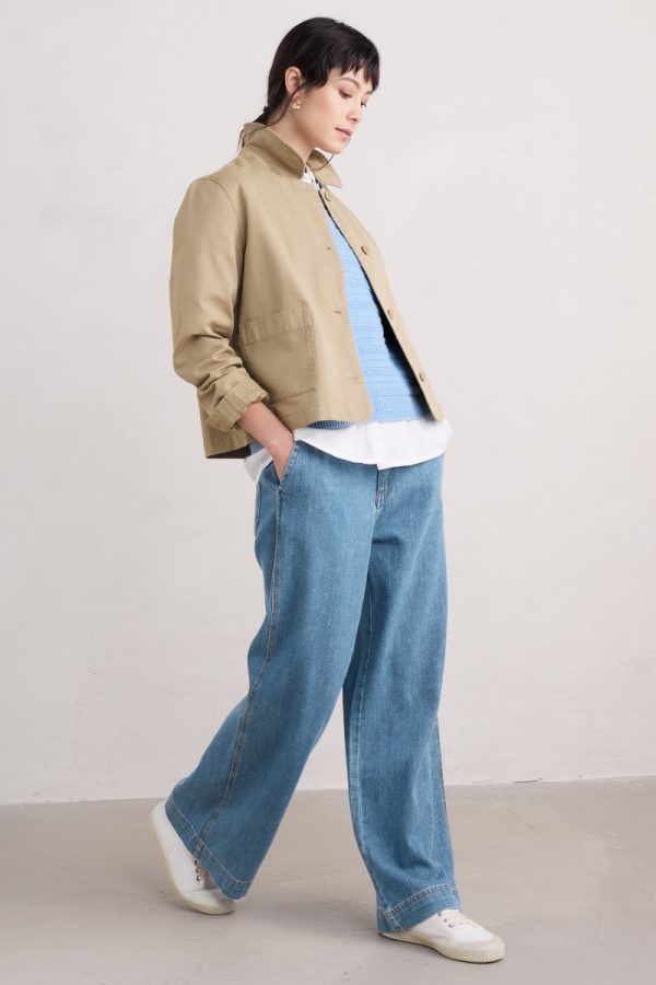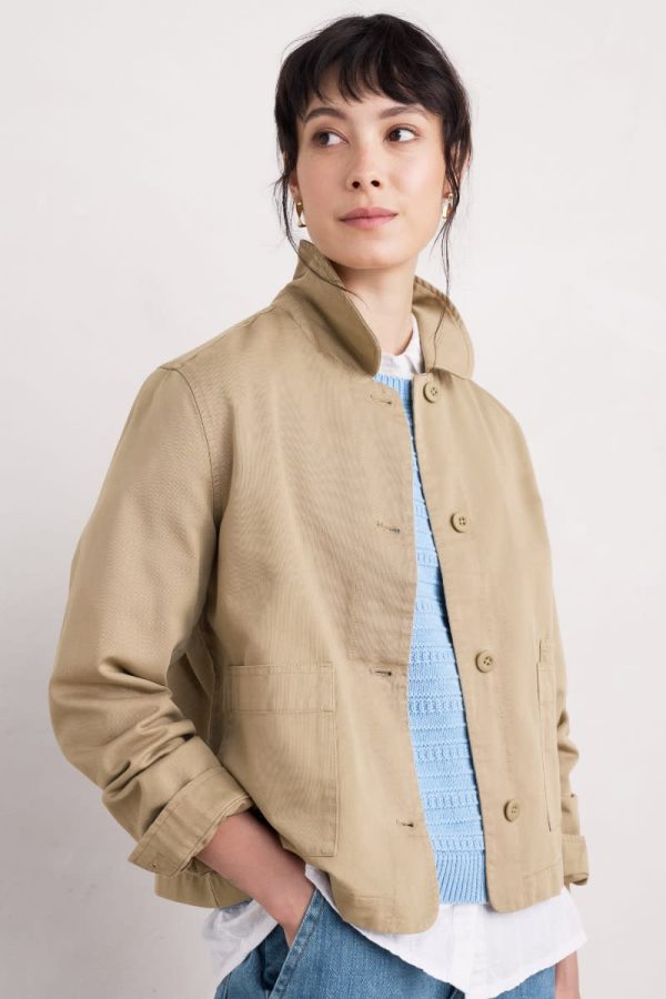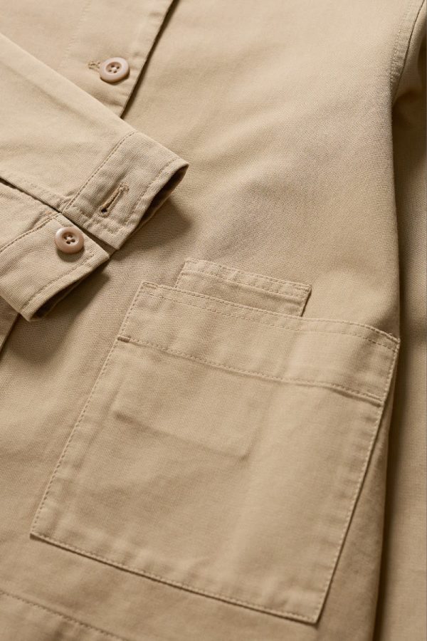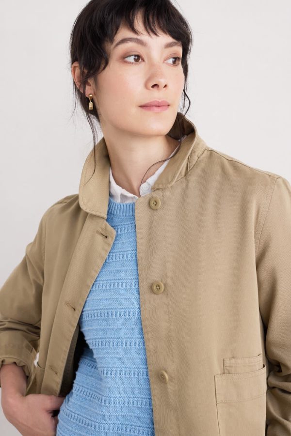 A jacket made from a cotton and linen blend with a subtly textured herringbone finish, garment dyed for a lovely soft, lived-in look. This workwear style is inspired by the studio wear of artists, with simple and easy styling, button cuffs, a rounded collar and square patch pockets, with an extra paint-brush compartment. A brilliant alternative to a denim jacket.