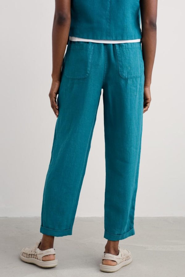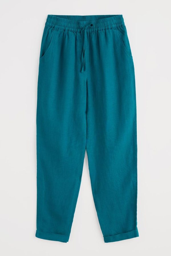 Linen trousers with a contemporary, relaxed tapered silhouette. They’re made from cool linen, garment-dyed for rich colour with unique highs and lows. Finished with a soft elasticated waistband, tie waist, side pockets and back patch pockets. They’ll become softer and smoother with every wash and wear.