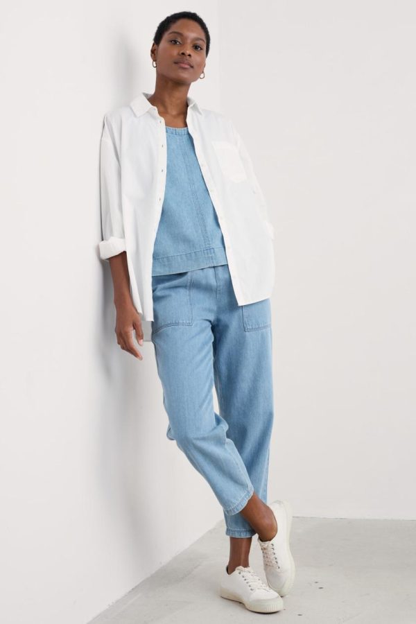 A relaxed vest for laid-back summer days, made from soft, light-wash denim with supple TENCEL. It has a scoop neck and a gently flared shape, with side splits in the hem for easy movement. Bust darts add subtle shaping, while the stitched detailing is a nod to classic denim styling.