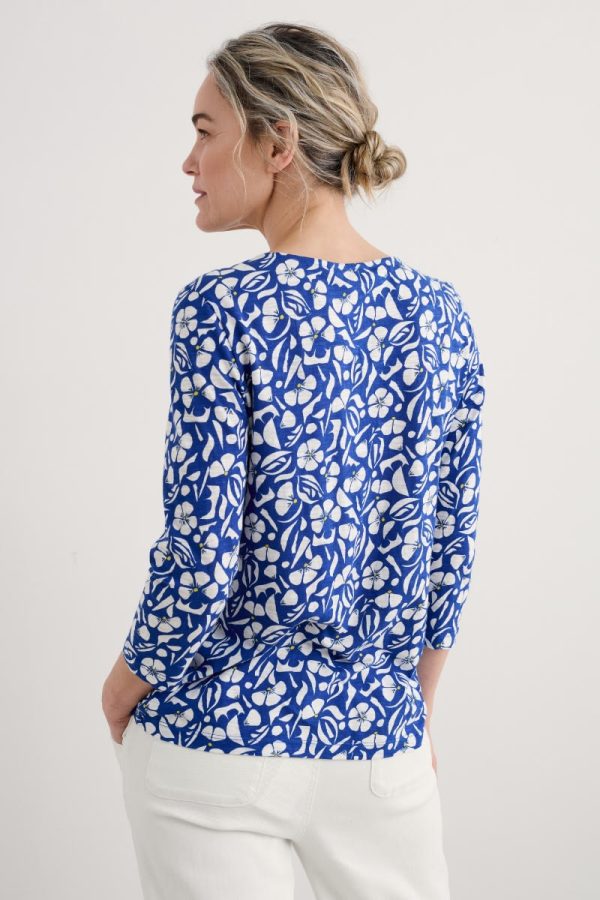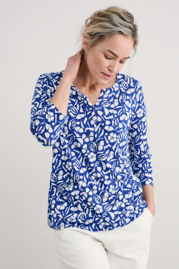 Our Gypsophilia Top is made from soft organic cotton jersey in a unique Seasalt print. It is designed for a relaxed fit and styled with 3/4 sleeves, a scoop neck with a notch detail and two front patch pockets. With organic cotton certified according to Global Organic Textile Standards by Soil Association. License Number: DK17684