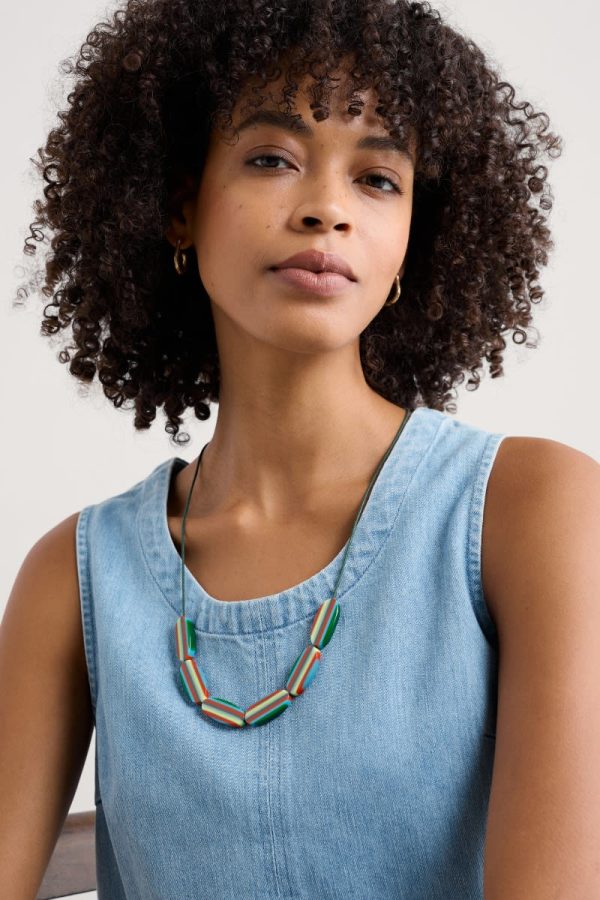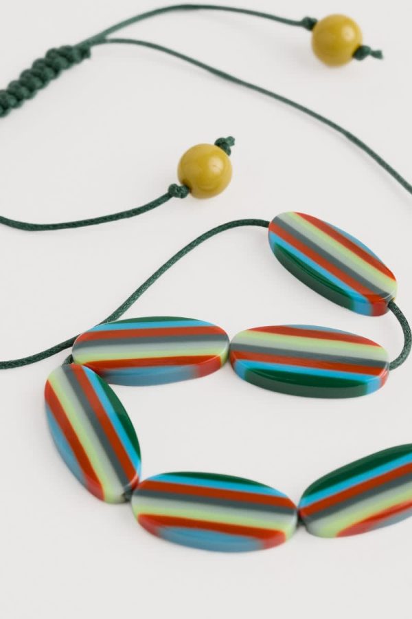 The appealing candy stripes of our Limonite necklace celebrate bright seaside style. This season’s vibrant palette comes together in these large, oval-shaped beads, which are crafted from smooth resin that makes the colours glow. Its slightly shorter length of 70cm can be adjusted to best suit your neckline, and the cotton cord is finished at the back with a pair of pretty beads.