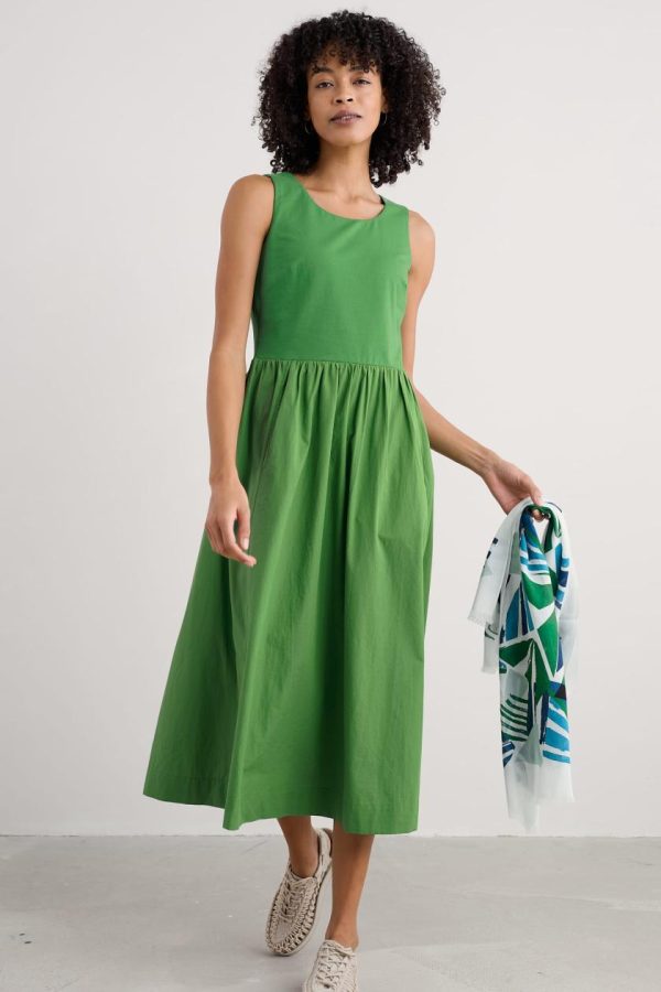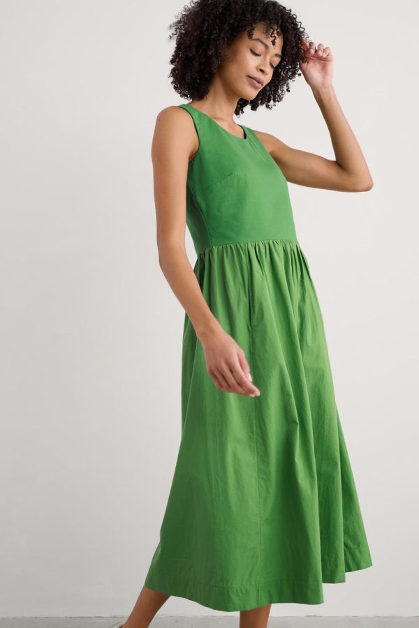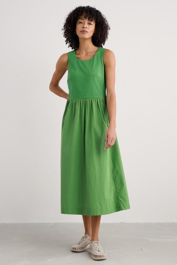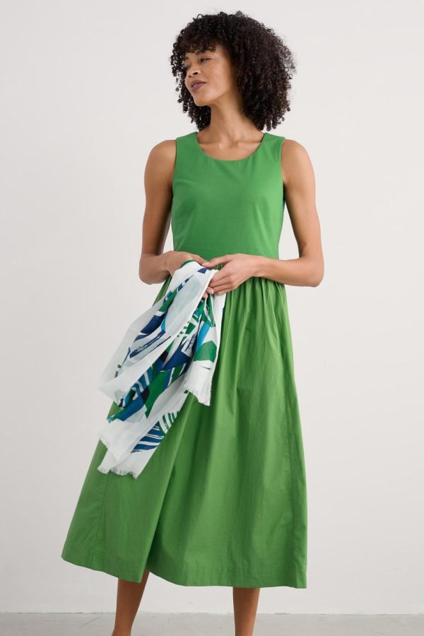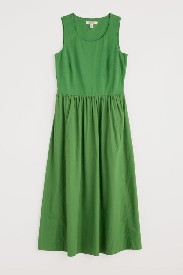 This summer’s go-anywhere piece. The Madder dress has a sleeveless bodice made from comfortable cotton-rich jersey, with bust darts for shaping and a deep scoop neckline. It opens out at the waist into an above-ankle-length woven skirt, with forward seams for a flattering shape. A pair of side pockets adds the finishing touch. A summery update of our much-loved half-sleeve Madder Dress.