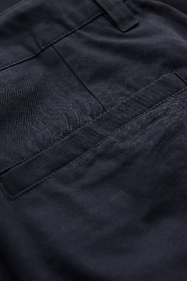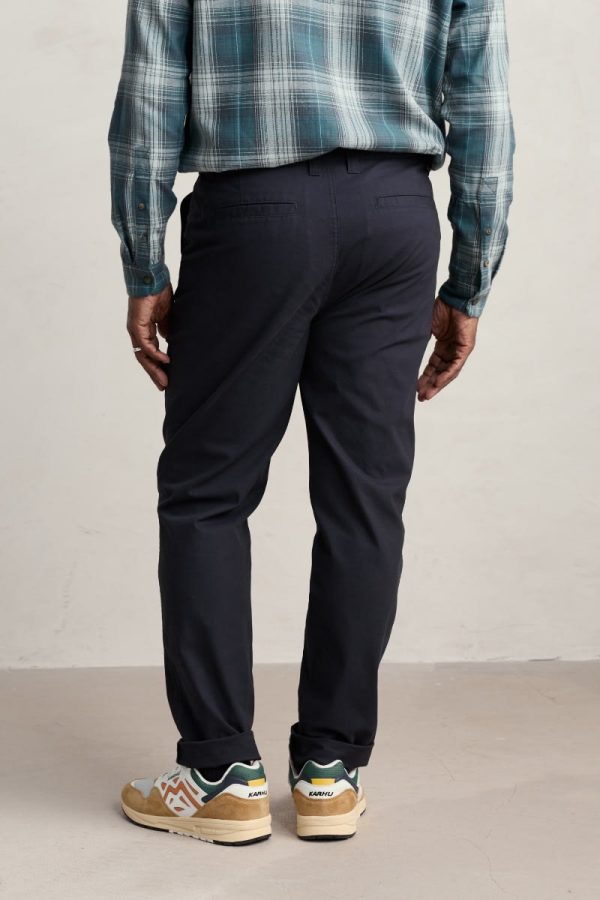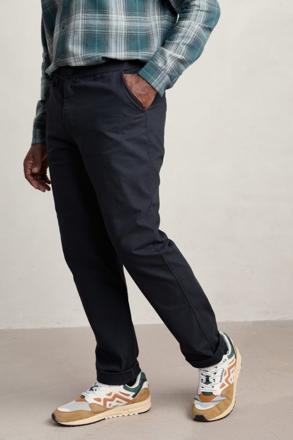 Slightly tapered trousers crafted from durable organic cotton with practical heritage details. Small elastic inserts in the inside waist give a comfortable flex to the fit, and a handy coin pocket is positioned on the hip beside the angled pocket.