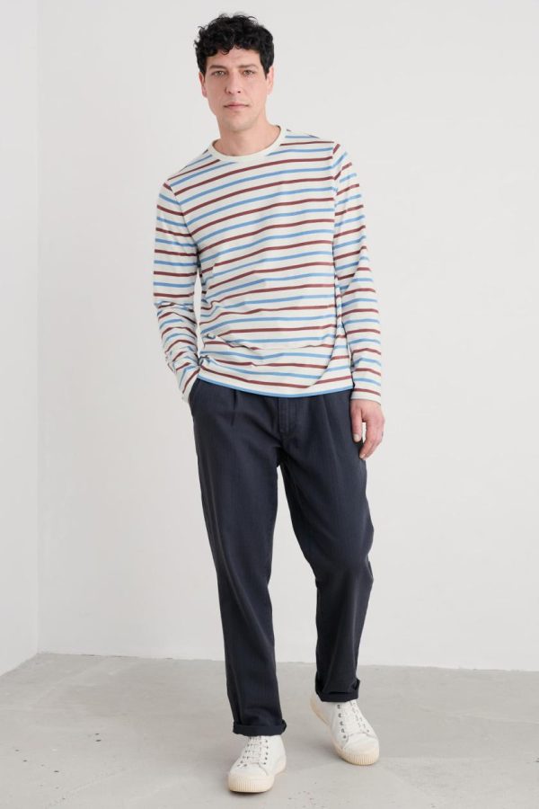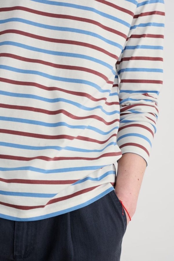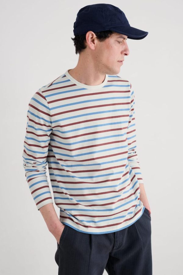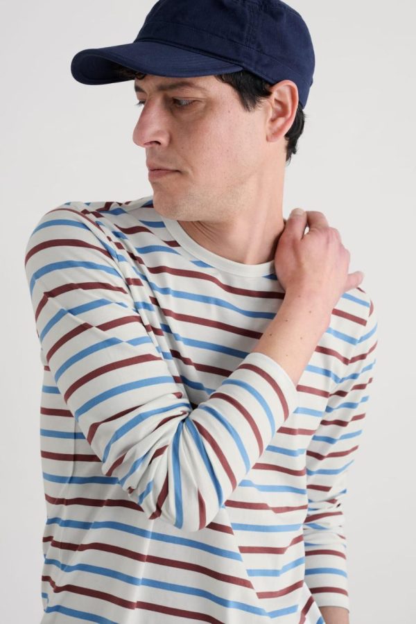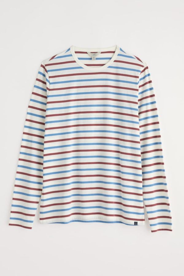A crew neck long sleeve T-shirt, with yarn-dyed stripes inspired by Breton tops and colours drawn from Cornwall’s maritime heritage for an authentic nautical feel. Made with breathable organic cotton jersey, it’s a year-round essential you’ll reach for again and again.