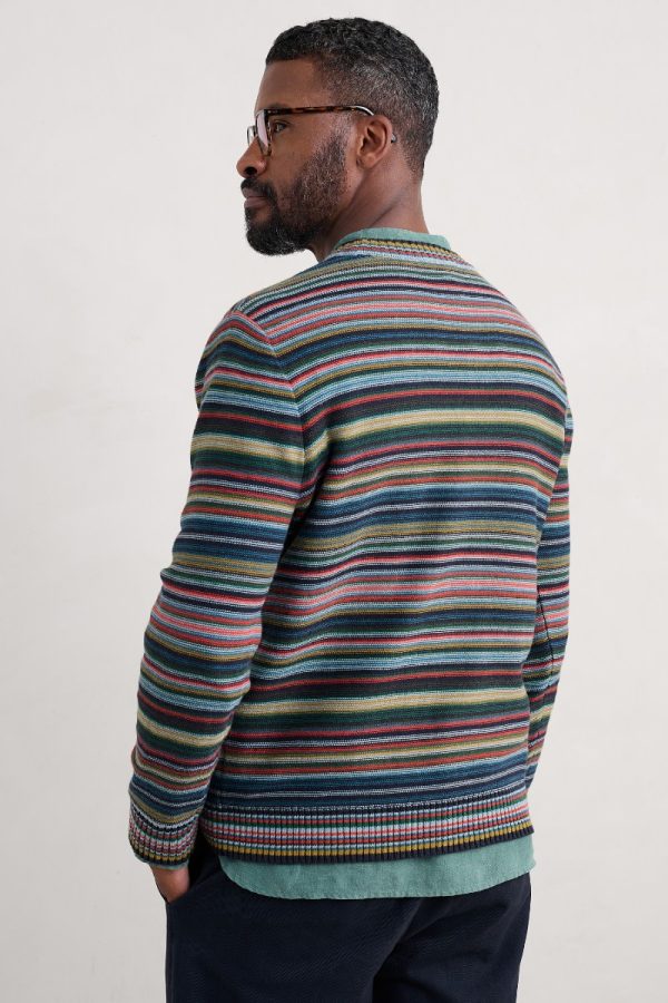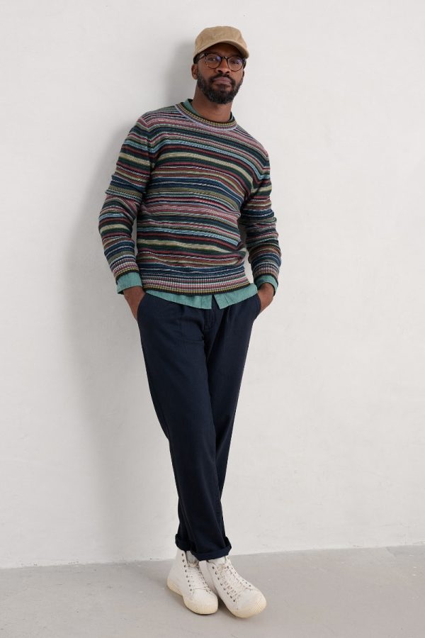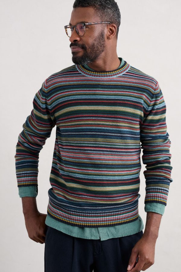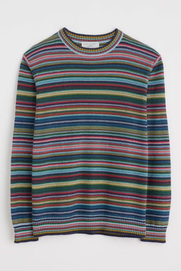 A comfy medium-weight jumper knitted from soft organic cotton. We’ve used a reverse stitch to give the jumper a gently textured finish, while narrow horizontal stripes bring a dash of Cornish colour to your transitional wardrobe. It’s finished with striped ribbed trims at the crew neck, hem and cuffs.