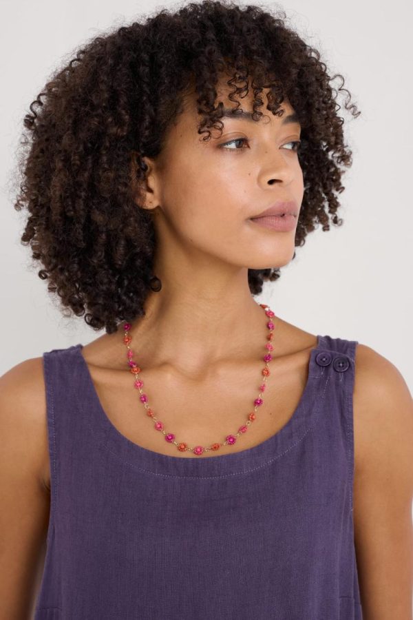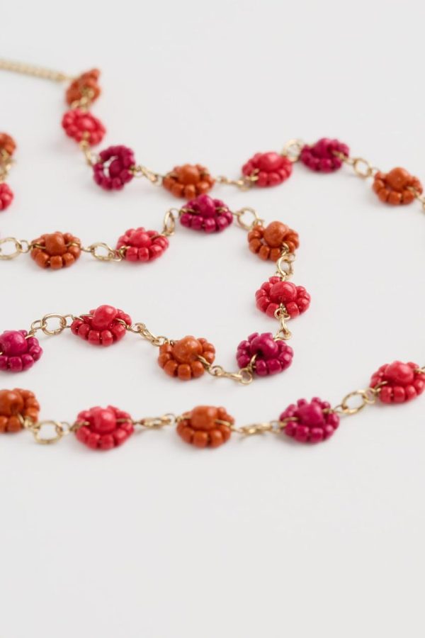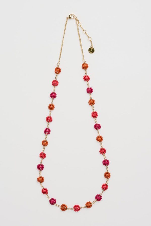 A pattern of dainty beaded flowers and small gold tone links in a single string. A delicate and stylish necklace with rich, autumnal colours that are designed to pair perfectly with this season’s palette. Look out for the matching Polyantha earrings, too.
