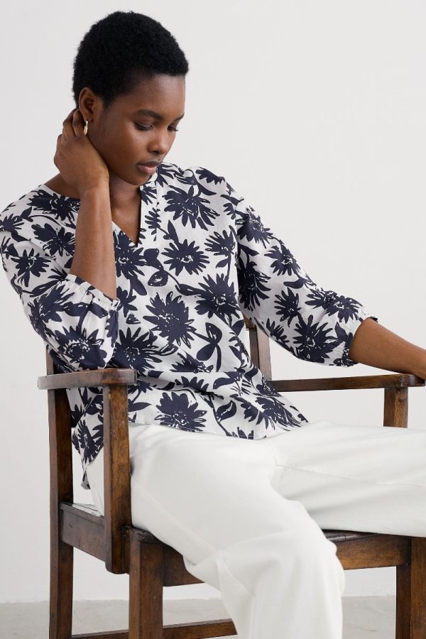 Crafted from light and breathable GOTS-certified organic cotton and made for sunny days. Our Streamlet Top has an easy swing shape with dropped shoulders for a relaxed feel. The soft three-quarter blouson sleeves complement the drapey bodice, while the V-shaped notch neckline adds a contrasting focal point. In an original Seasalt floral print.