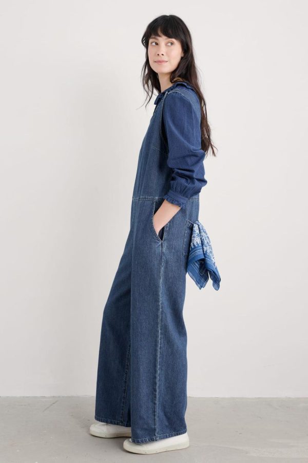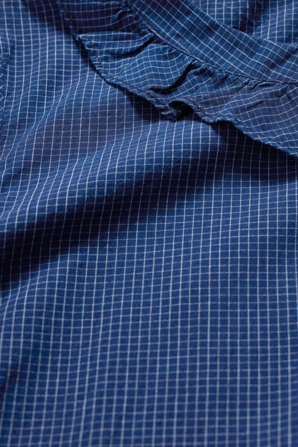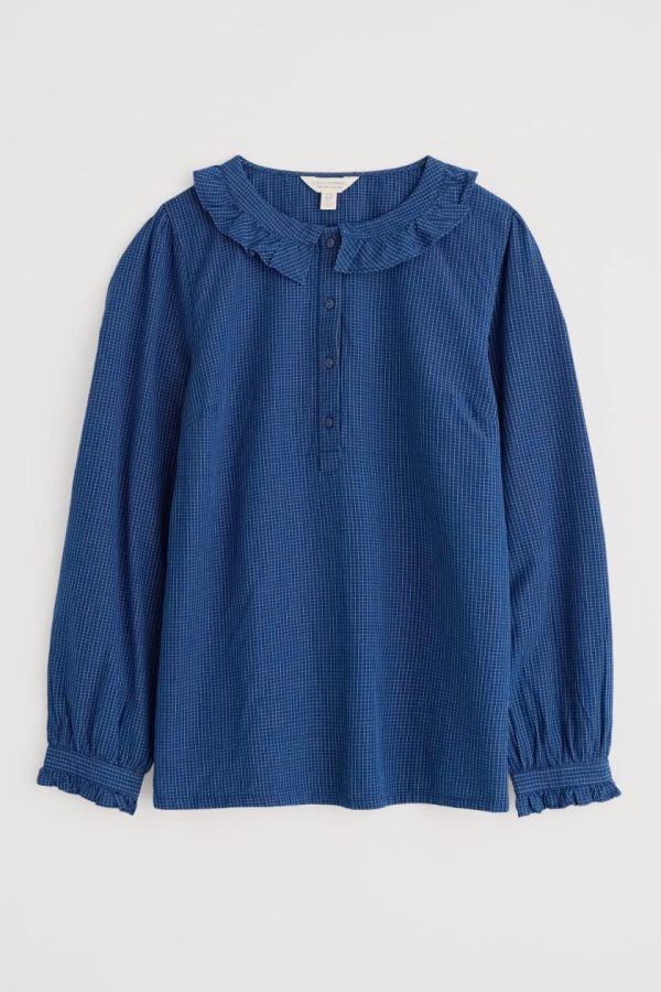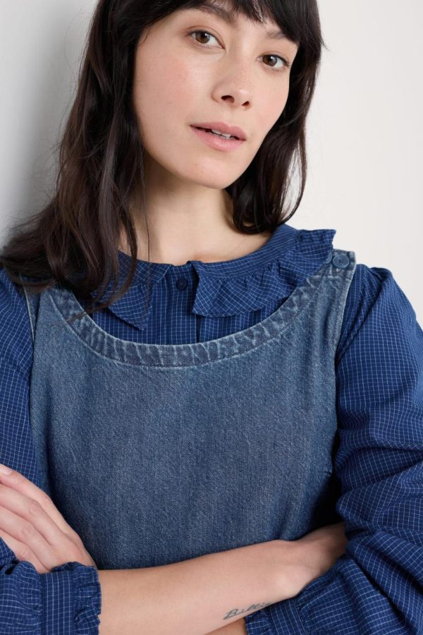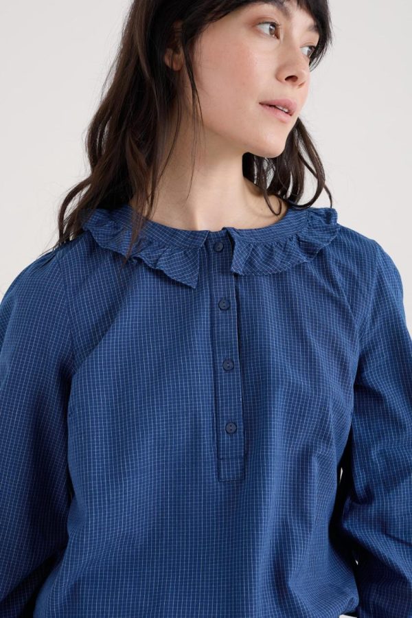 Our easy-fitting top is made from soft organic cotton chambray with a subtle yarn-dyed check. We’ve added a pretty frilled collar that sits flat above the half placket, matching the details on the button cuffs. Gentle gathers create a lovely, loose drape, while bust darts add a touch of shaping. The top is indigo dyed, so colour may transfer onto pale surfaces.